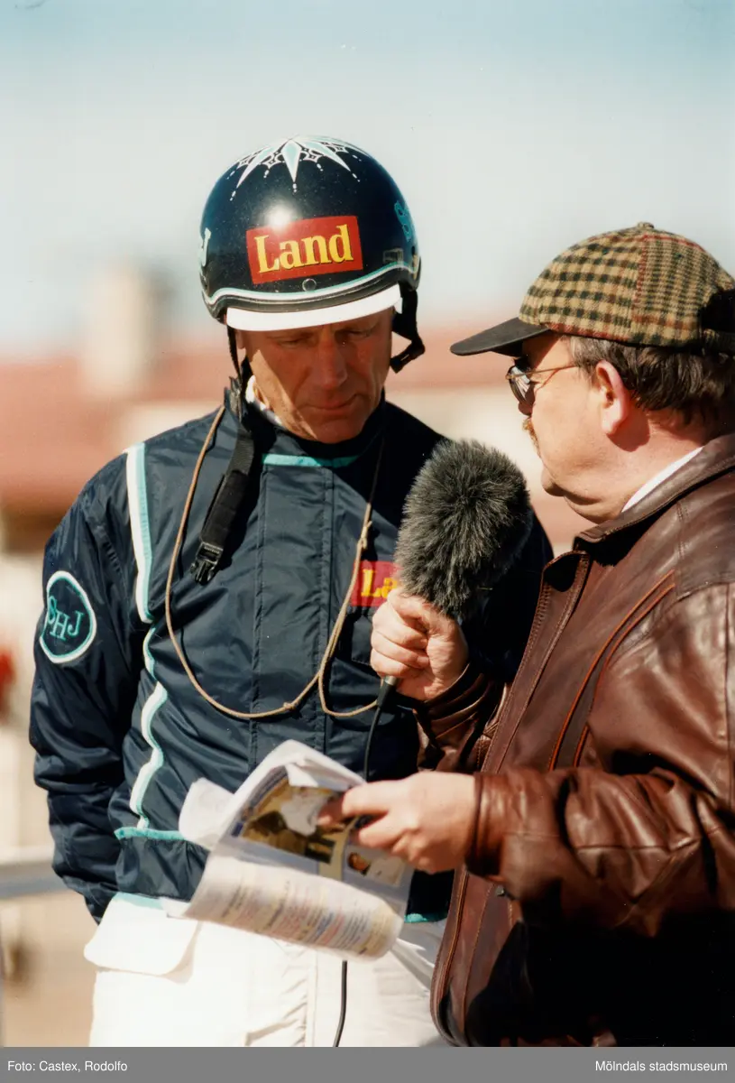 Leif "Loket" Olsson intervjuar travkusken Stig H. Johansson i samband med travloppet Drottning Silvias Pokal på Åbytravet i Åby, Mölndal, lördagen den 3 maj 1997.