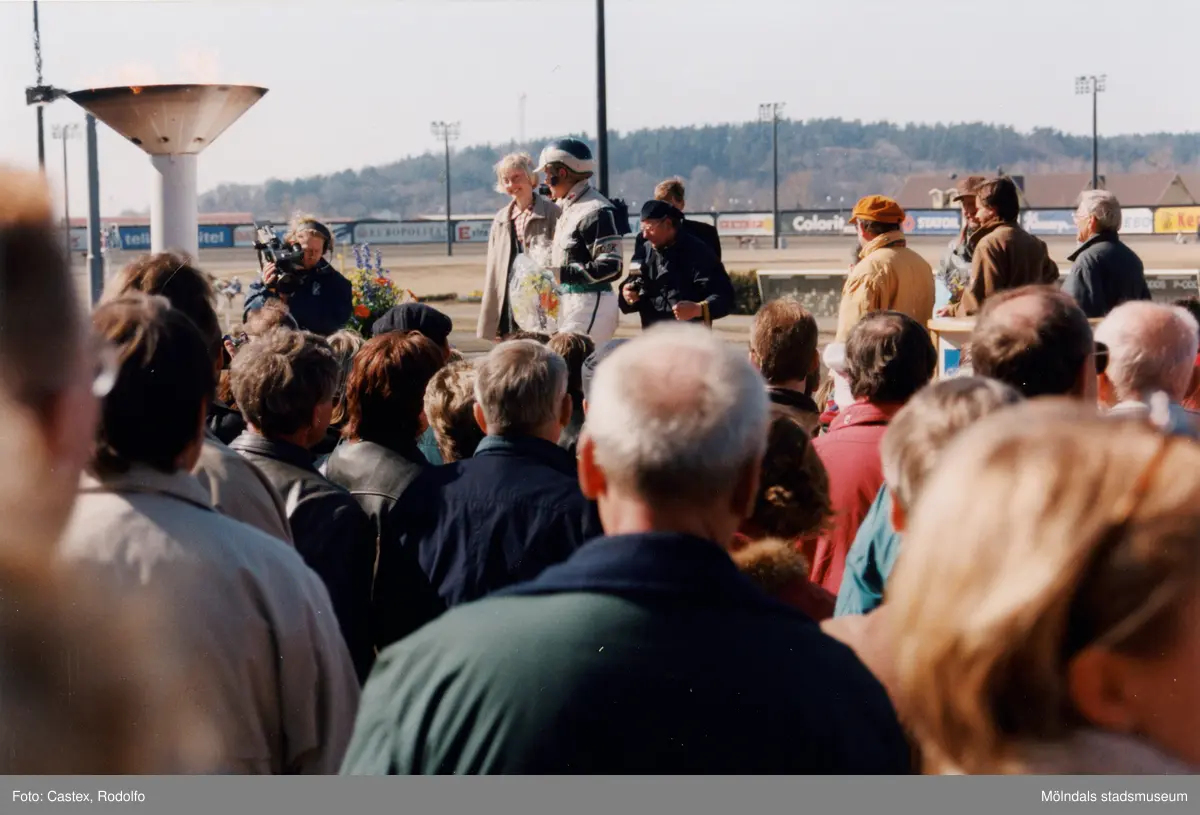 Friidrottaren Sara Wedlund får pris som årets stjärnskott 1995 i samband med travloppet Olympiatravet på Åbytravet i Åby, Mölndal, den 13 april 1996. Här står hon bredvid en travkusk intill den olympiska elden.