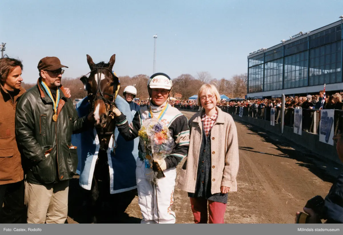 Friidrottaren Sara Wedlund får pris som årets stjärnskott 1995 i samband med travloppet Olympiatravet på Åbytravet i Åby, Mölndal, den 13 april 1996. Här står hon bredvid en travkusk med häst på travbanan.