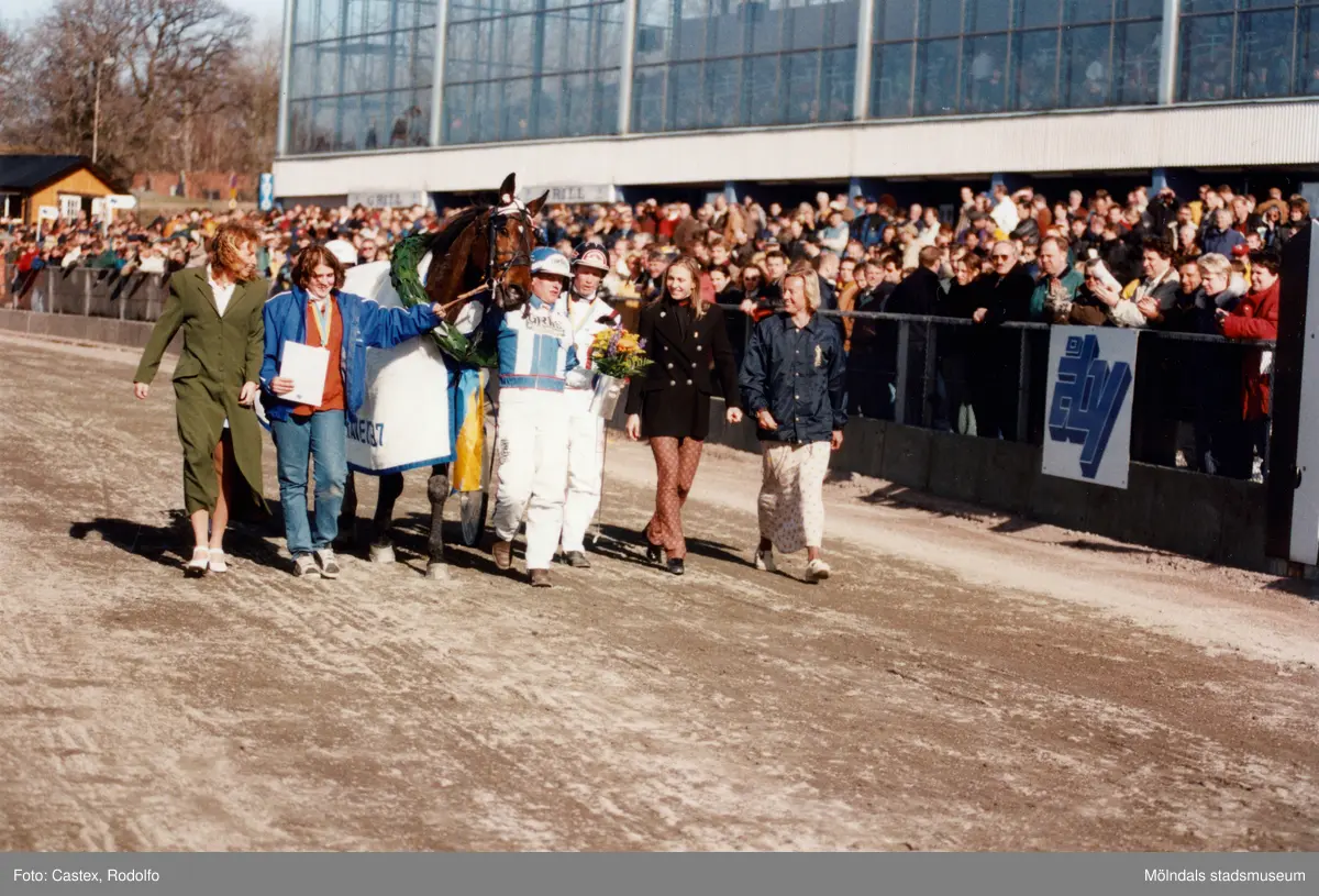 Travloppet Olympiatravet på Åbytravet i Åby, Mölndal, lördagen den 12 april 1997. Segrande travekipaget Lars Marklund och Scandal Play ute på banan efter loppet. Bredvid går friidrottaren Ludmila Engquist och kanotisterna Agneta Andersson och Susanne Gunnarsson.