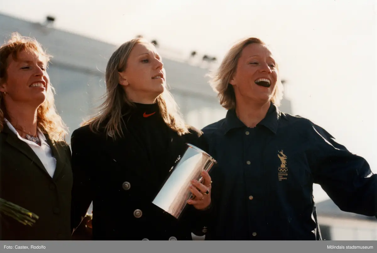 Travloppet Olympiatravet på Åbytravet i Åby, Mölndal, lördagen den 12 april 1997. Friidrottaren Ludmila Engquist och kanotisterna Agneta Andersson och Susanne Gunnarsson är på plats vid travbanan. Ludmila håller i pokalen. Segrade gjorde Lars Marklund med Scandal Play.