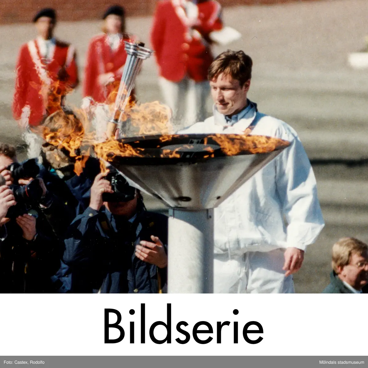 Serie om sju fotografier som visar ett par programpunkter i samband med travloppet Olympiatravet på Åbytravet i Åby, Mölndal, den 13 april 1996. Bordtennisspelaren Jan-Ove Waldner tänder den olympiska elden, för första gången någonsin i Göteborg. Friidrottaren Sara Wedlund får pris som årets stjärnskott 1995. Underhållning av Mölndals Paradorkester.