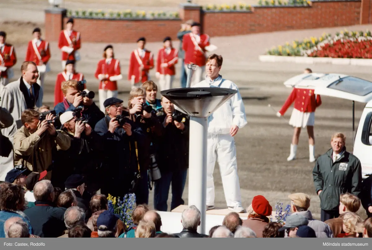 Bordtennisspelaren Jan-Ove Waldner tänder den olympiska elden som för första gången någonsin brinner i Göteborg. Detta i samband med travloppet Olympiatravet på Åbytravet i Åby, Mölndal, den 13 april 1996. I bakgrunden underhåller Mölndals Paradorkester.
