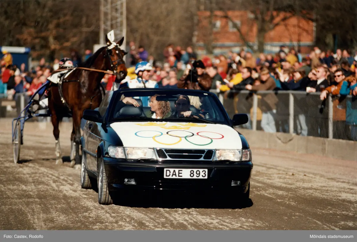 Travloppet Olympiatravet på Åbytravet i Åby, Mölndal, lördagen den 12 april 1997. Friidrottaren Ludmila Engquist och kanotisterna Agneta Andersson och Susanne Gunnarsson åker på travbanan med bil.