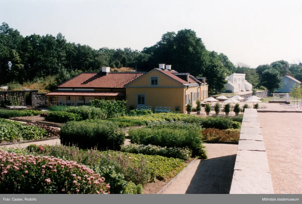 Tjenstemannabostaden med tillhörande köksträdgård vid Gunnebo slott i Gunnebo, Mölndal, i juli 1999. Byggnaden används som restaurang och kafé. Något längre bort ses drivhuset som återskapades 1996-1999 efter gamla ritningar.