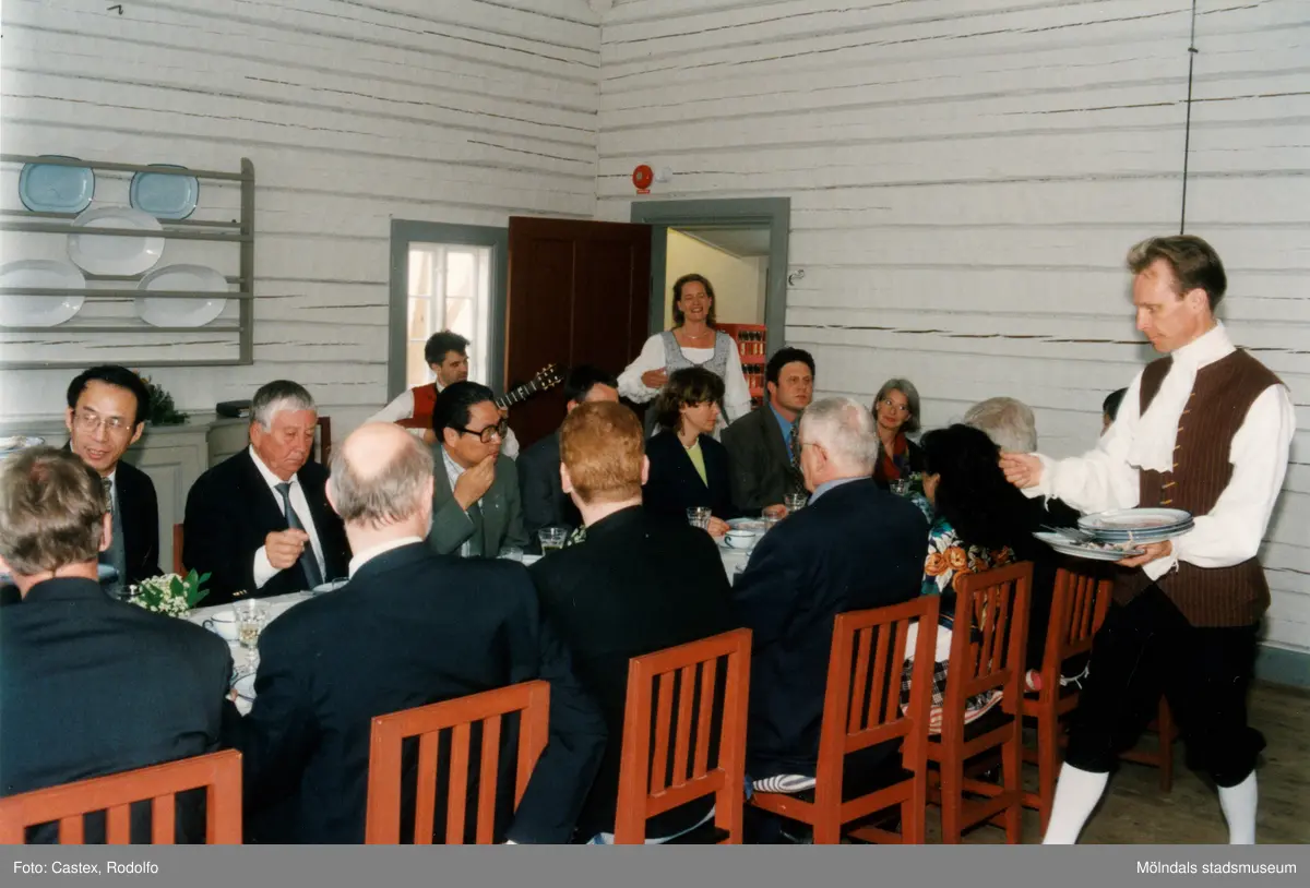 Titel: Venezuelas ambassadör Sadio Garavini di Turno besöker Gunnebo slott i Mölndal, juni 1999. Gästerna intar en måltid i restaurangen. Martin Bagge med sångerska underhåller med musik.