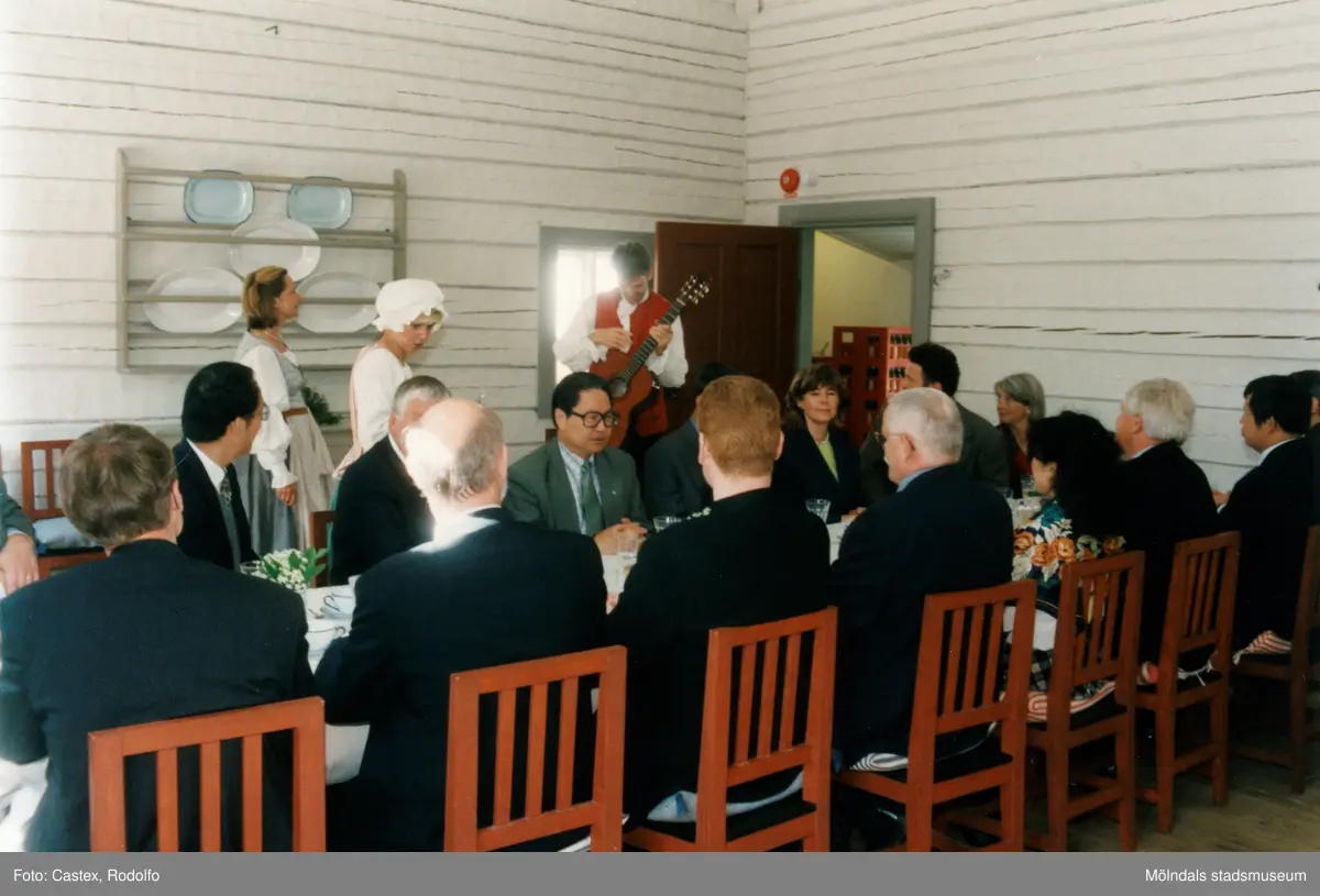 Venezuelas ambassadör Sadio Garavini di Turno besöker Gunnebo slott i Mölndal, juni 1999. Gästerna intar en måltid i restaurangen. Martin Bagge med sångerska underhåller med musik.