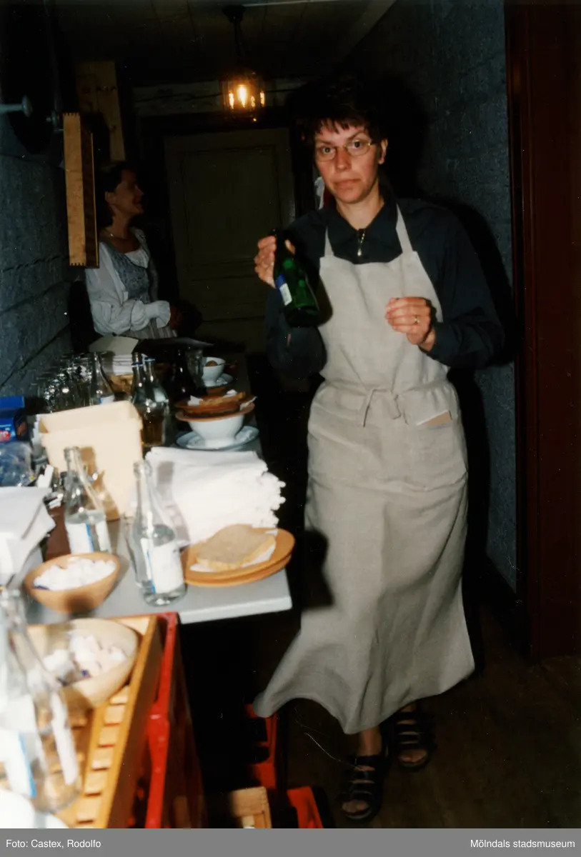 Venezuelas ambassadör Sadio Garavini di Turno besöker Gunnebo slott i Mölndal, juni 1999. En kvinna ur kökspersonalen kommer med dryck medan gästerna intar en måltid i restaurangen.