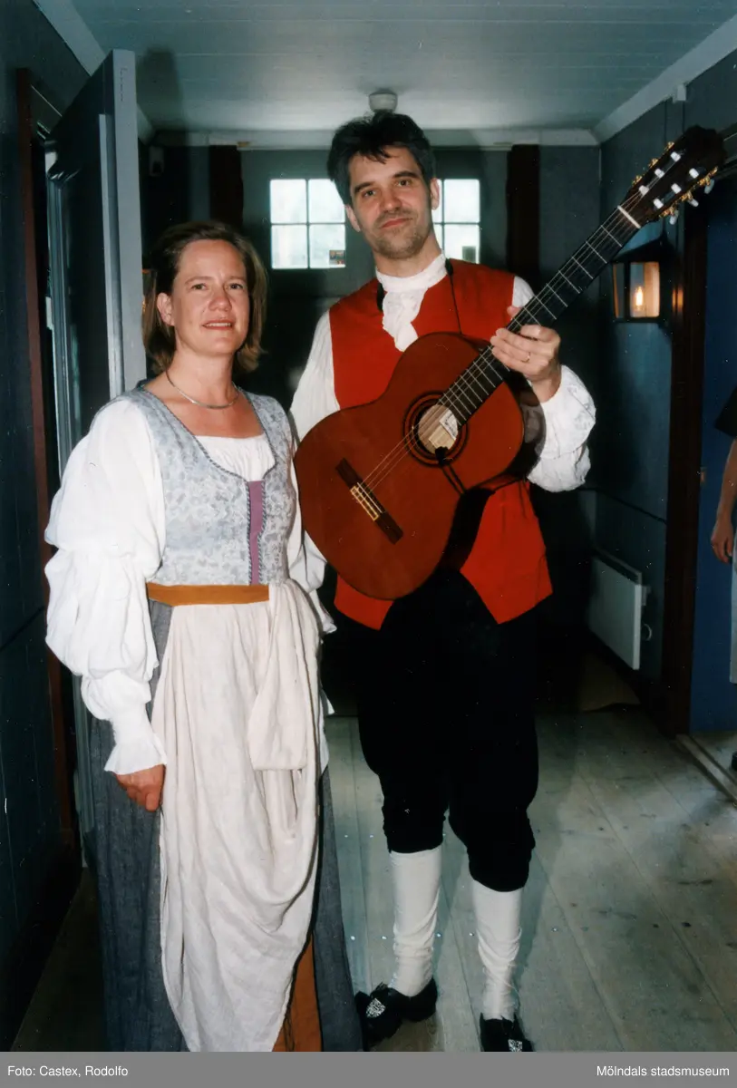 Venezuelas ambassadör Sadio Garavini di Turno besöker Gunnebo slott i Mölndal, juni 1999. Porträtt av musikern Martin Bagge och en sångerska. Båda uppklädda. Paret underhöll gästerna under måltiden i restaurangen.