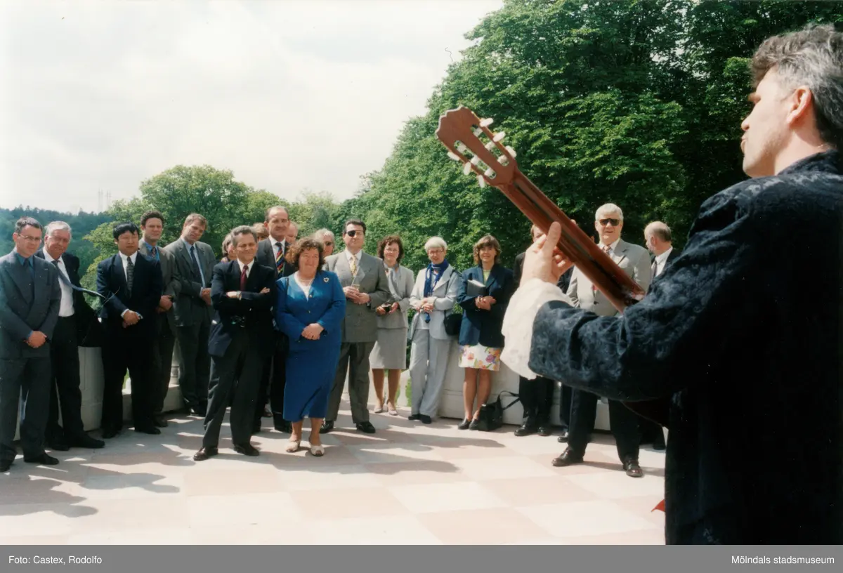 Venezuelas ambassadör Sadio Garavini di Turno besöker Gunnebo slott i Mölndal, juni 1999. Utanför slottet underhåller musikern Martin Bagge gästerna.
