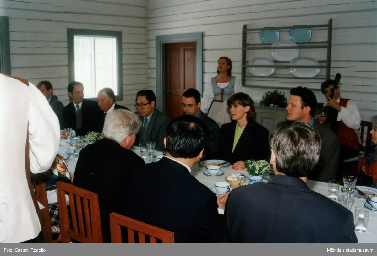 Venezuelas ambassadör Sadio Garavini di Turno besöker Gunnebo slott i Mölndal, juni 1999. Gästerna intar en måltid i restaurangen. Martin Bagge med sångerska underhåller med musik.
