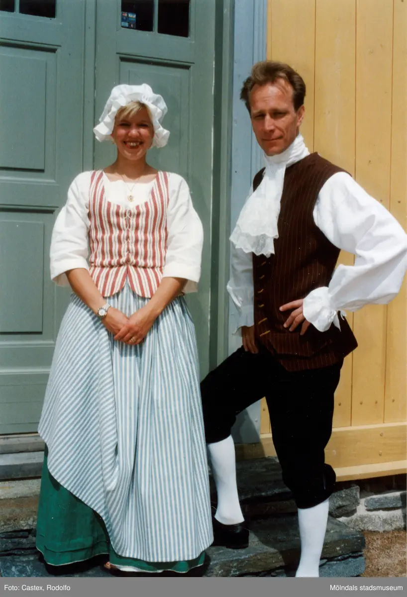 Venezuelas ambassadör Sadio Garavini di Turno besöker Gunnebo slott i Mölndal, juni 1999. En kvinna och en man ur serveringspersonalen utanför restaurangen. Båda uppklädda.