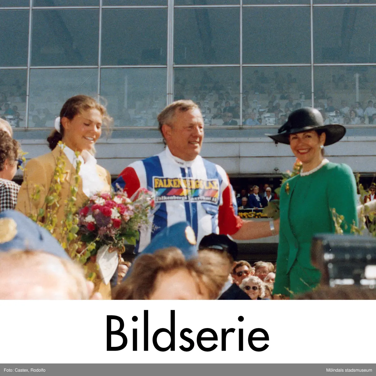 Serie om 9 fotografier som visar travloppet Drottning Silvias Pokal på Åbytravet i Åby, Mölndal, i maj 1993. Drottning Silvia och kronprinsessan Victoria är på plats vid travbanan.
