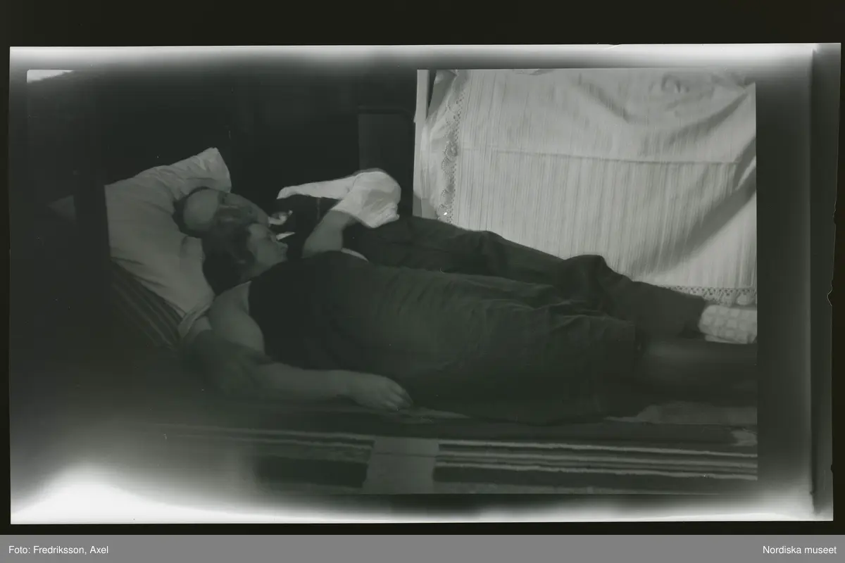 Ett par ligger och vilar tillsammans på en säng/dagbädd.