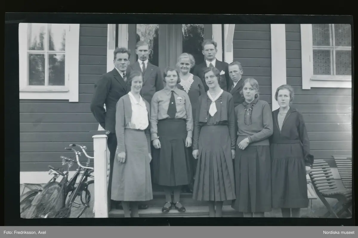 Grupporträtt, kvinnor och män uppställda på trappan till en byggnad.