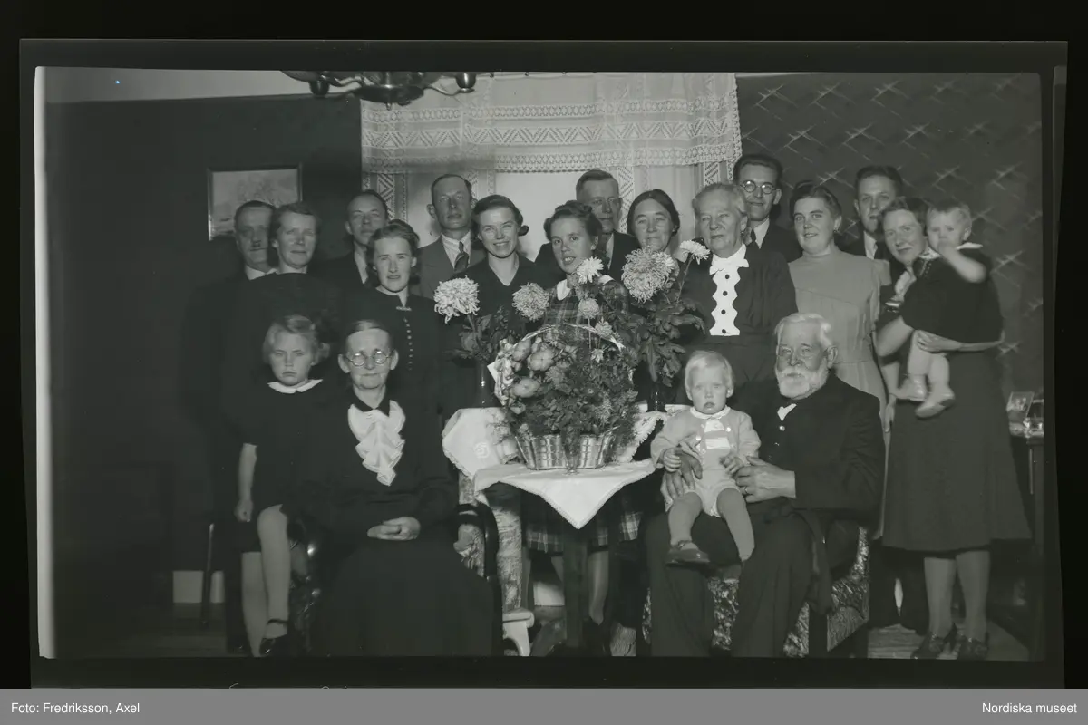 Grupporträtt av släkt och vänner vid ett födelsedagsfirande.