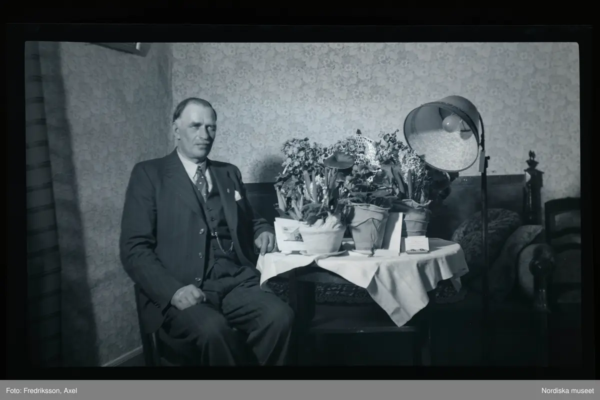 Porträtt av en man som sitter vid ett bord fullt av gratulations-blommor.