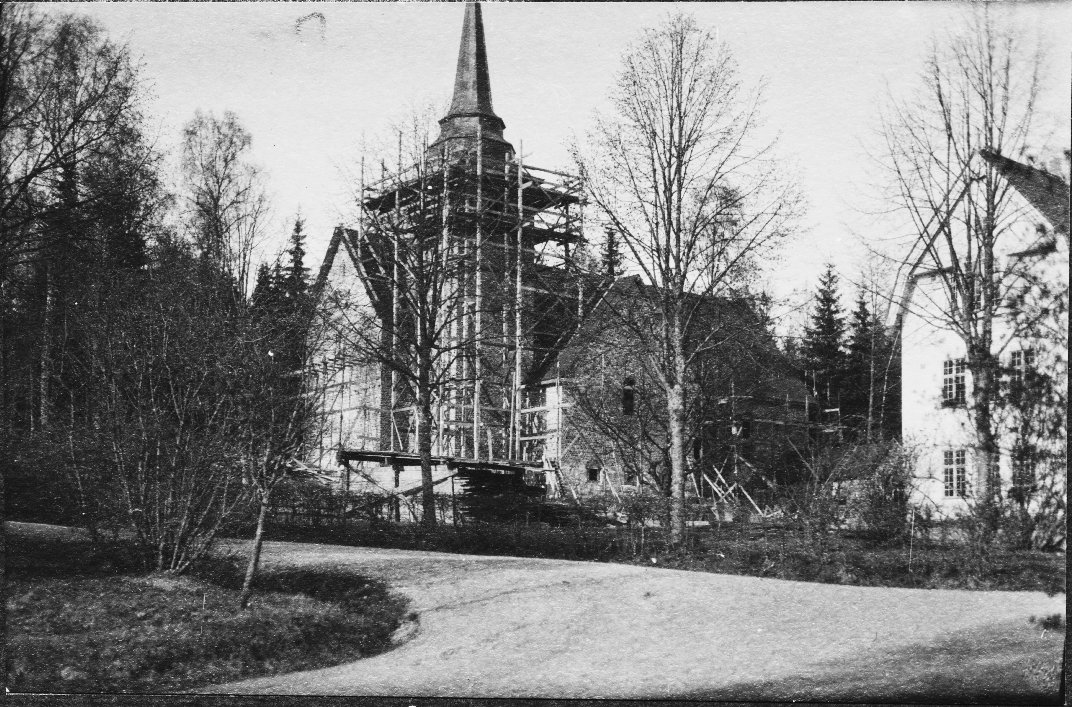 Kyrkan mot nordöst med förbindelsegång till skolbyggnad.