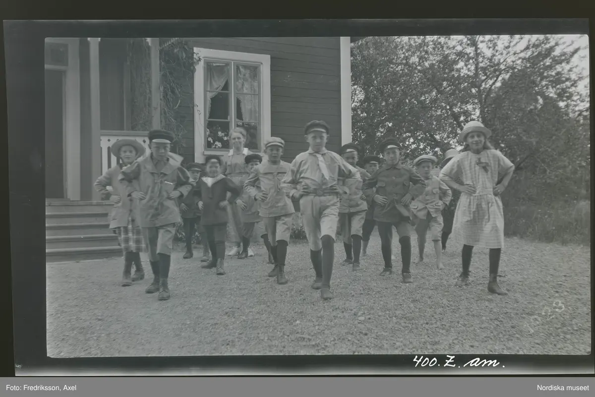 Utanför en skola övar en skolklass barn möjligen dans eller gymnastik.