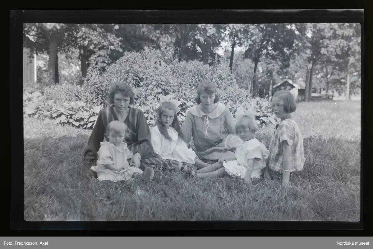 Ett sällskap kvinnor och barn sitter ute i en trädgård.
