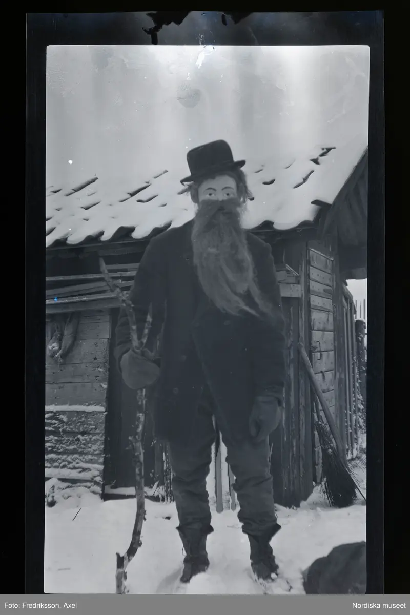 En utklädd man i lösskägg och ansiktsmask.
