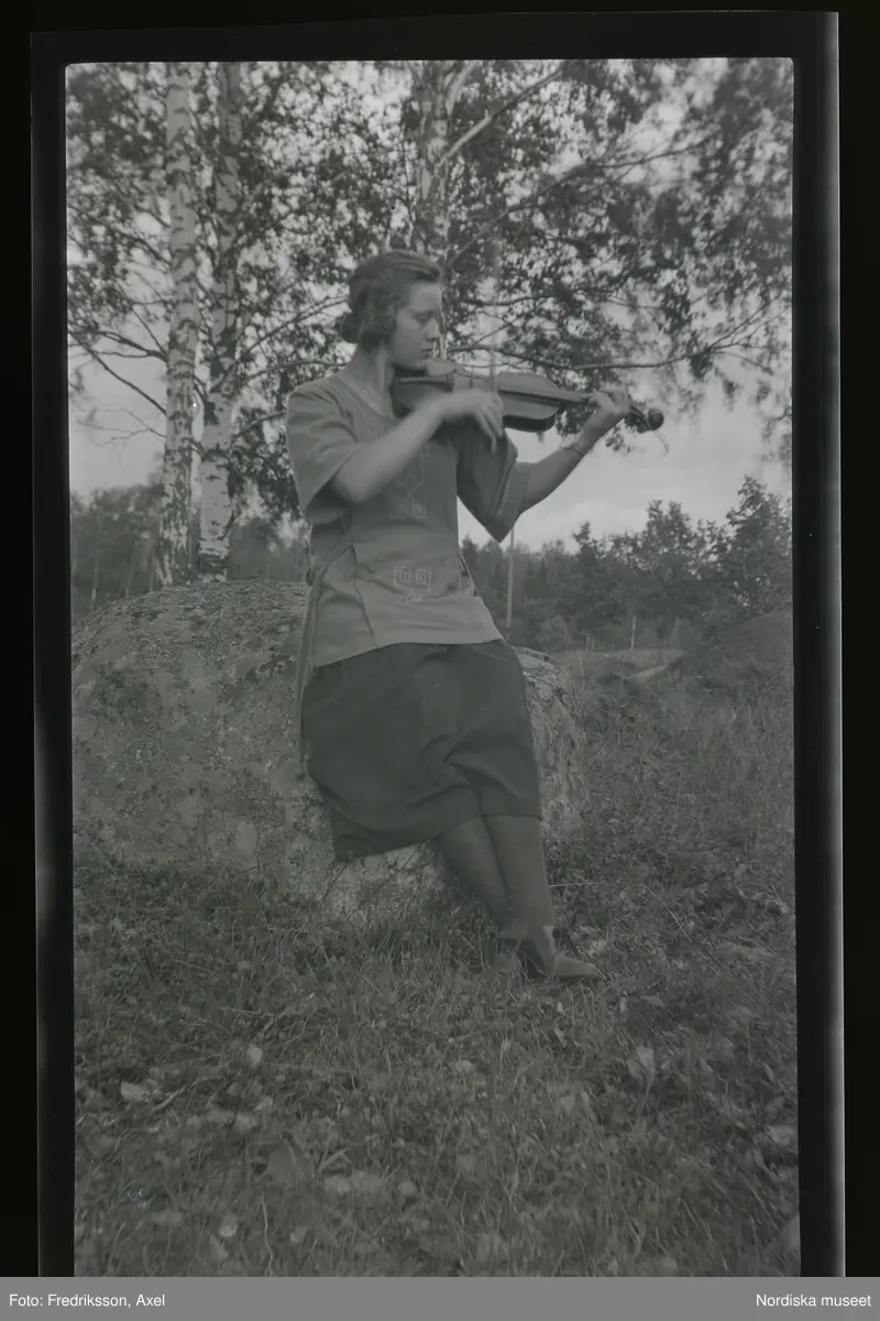 En ung kvinna sitter utomhus och spelar fiol.