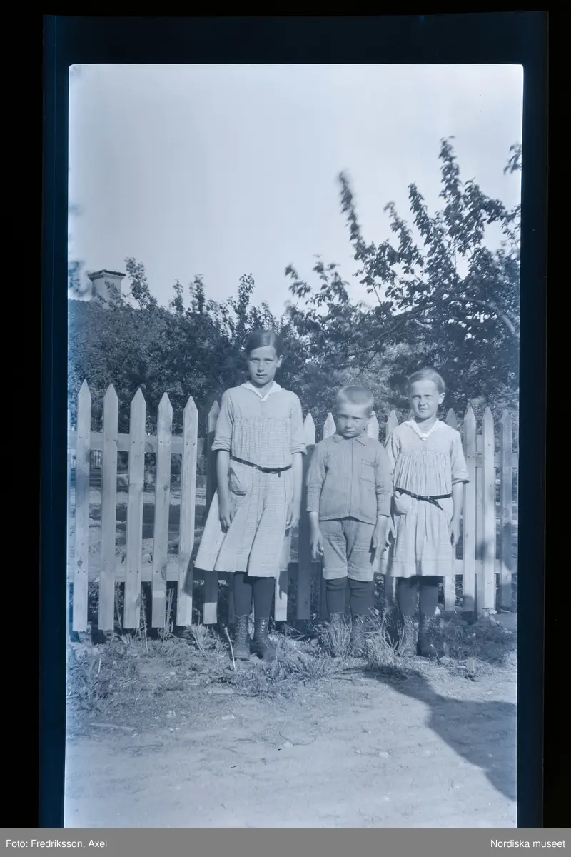 Tre barn poserar vid ett staket.