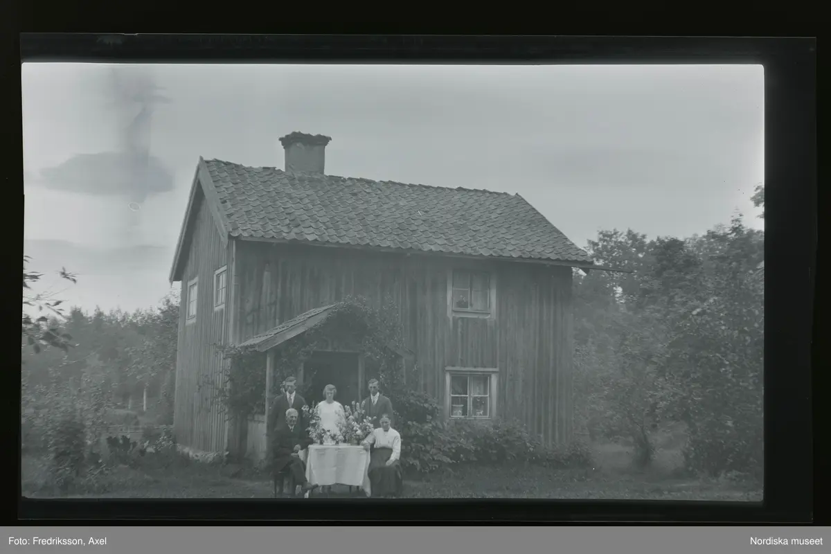 Familj framför sitt hus.