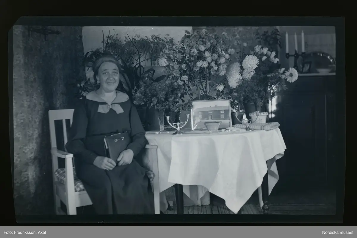 En kvinna sitter vid ett bord med gratulations-blommor.