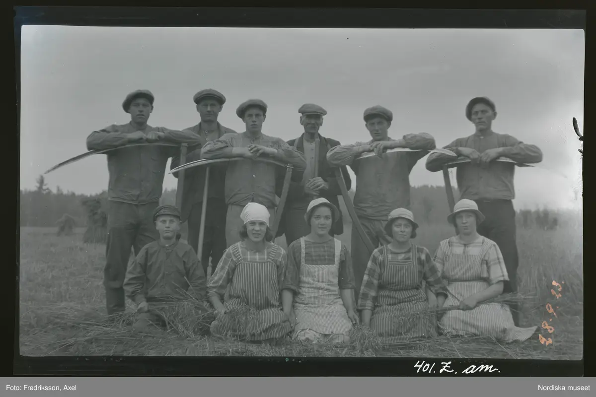 Grupporträtt av ett arbetslag på en åker/ äng. Männen står lutade mot sina liar.