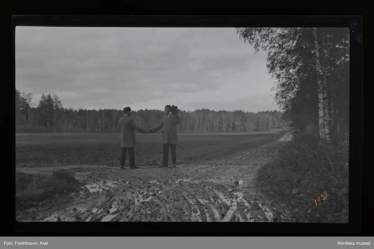 Två män tar i hand och hälsar på varandra i en lerig vägkorsning.
