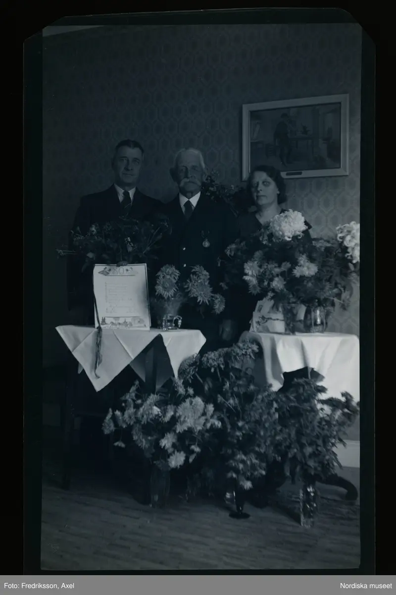 Två män och en kvinna står i ett rum vid ett par bord med gratulations-blommor.