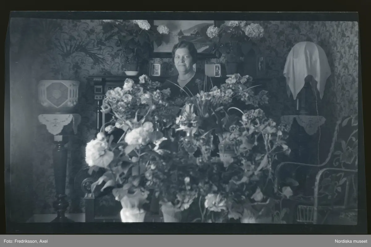 Titel: "Maria Olsson, Segerhult." Porträtt av en kvinna som står vid ett bord fullt av gratulations-blommor.