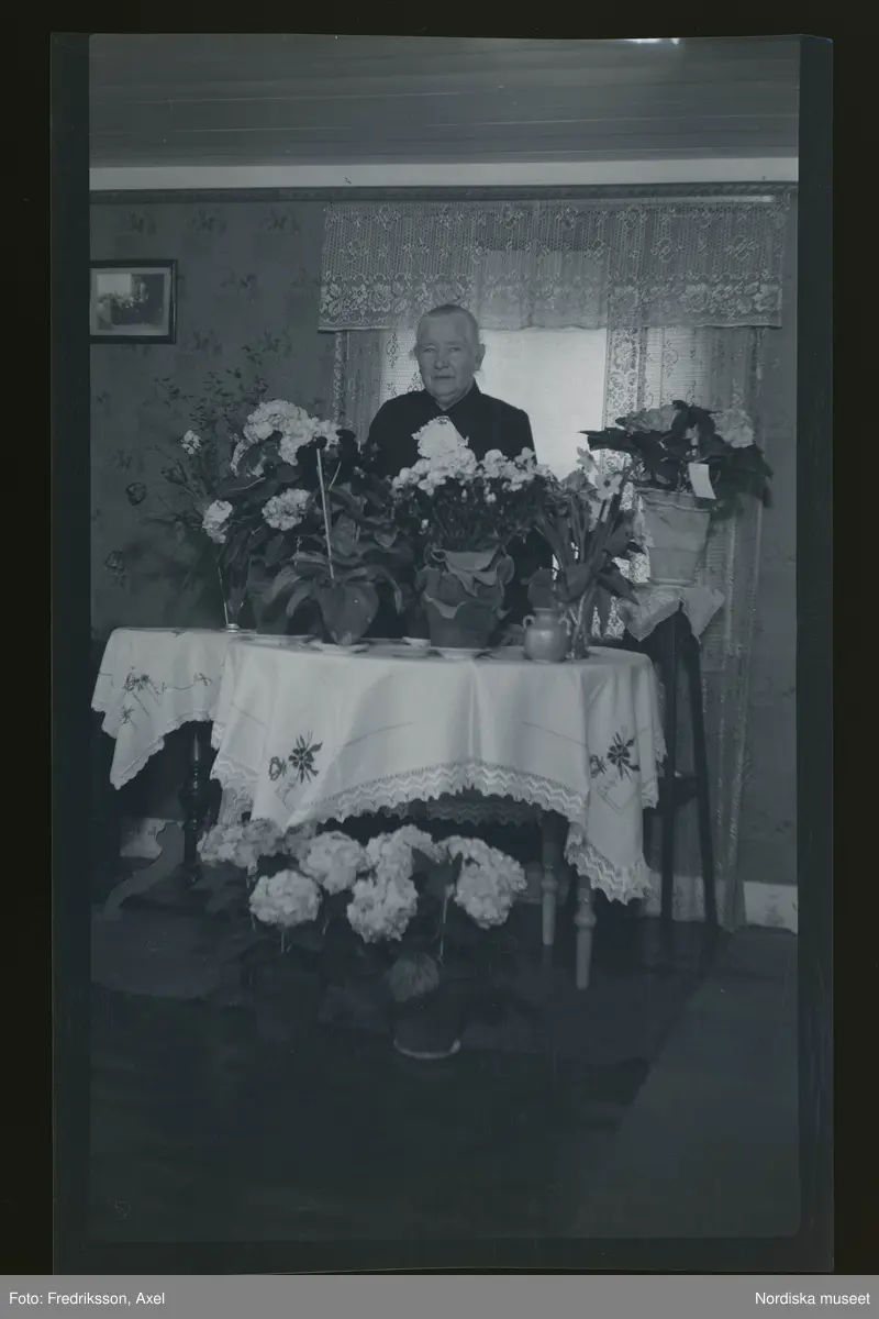 Porträtt av en kvinna som står vid ett bord fullt av gratulations-blommor.