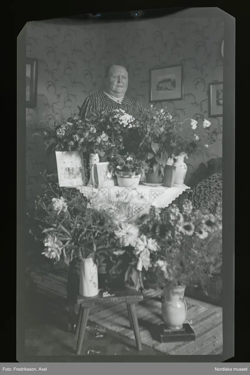 Porträtt av en kvinna som står vid ett bord fullt av gratulations-blommor.