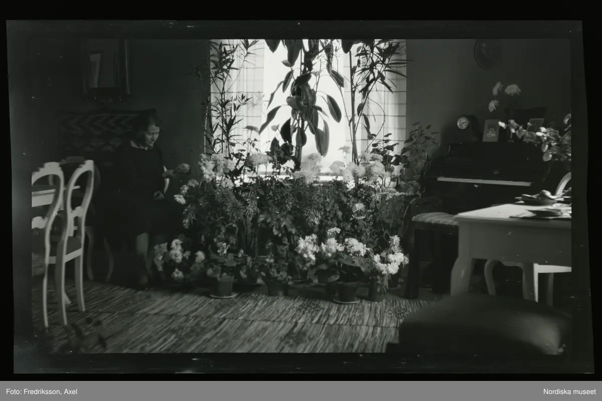En kvinna pysslar med blommande krukväxter i ett rum.