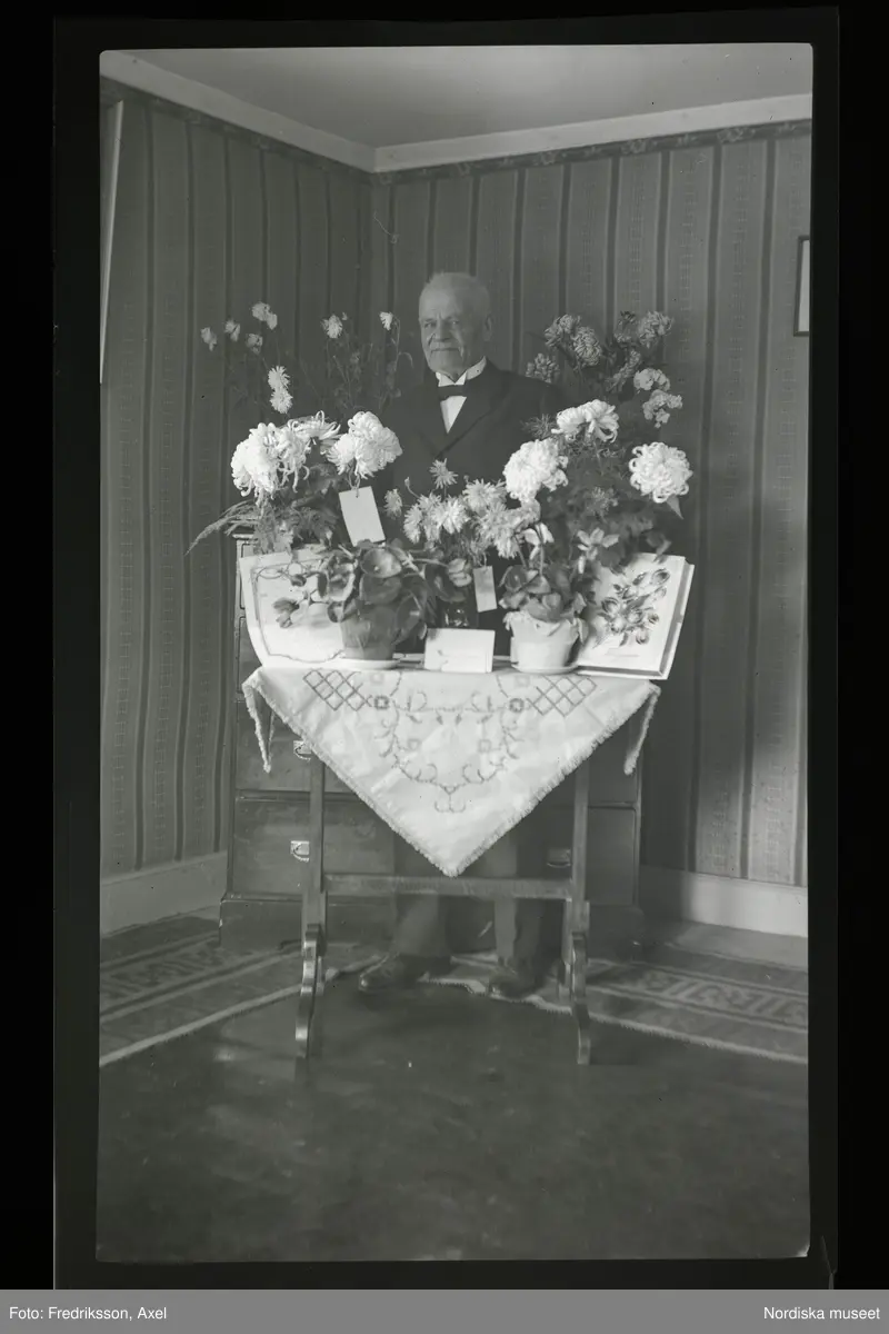 Porträtt av en man som står vid ett bord fullt av gratulations-blommor.
