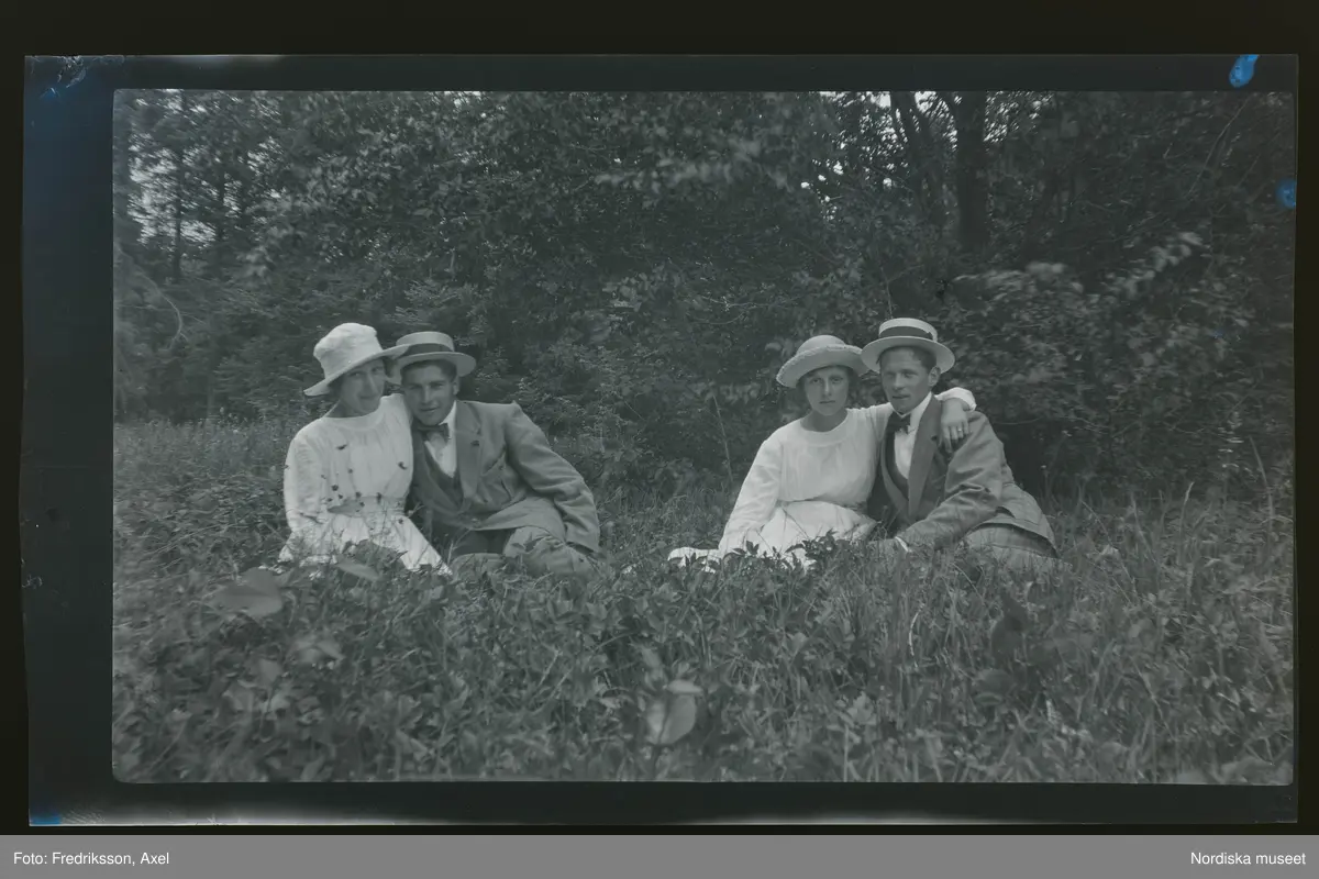 Två unga par sitter omslingrade ute på en äng.