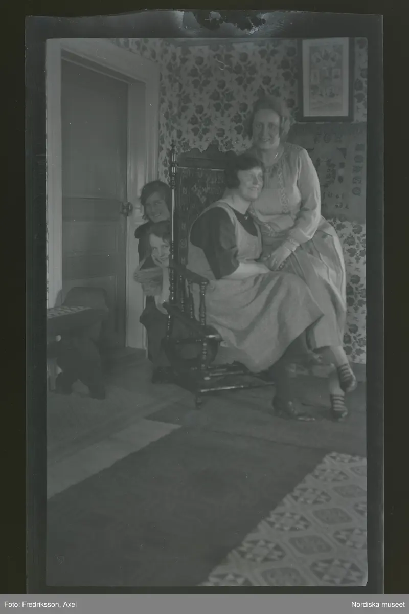 Frida Fredriksson sitter i en gungstol och håller om en väninna som sitter på armstödet. Bakom gungstolen kikar två andra kvinnor fram.