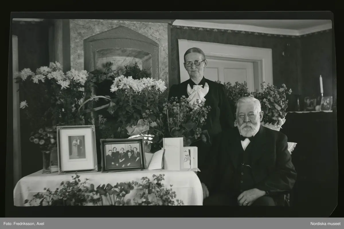 Porträtt av en kvinna som står och en man sitter vid ett bord fullt av gratulations-blommor.