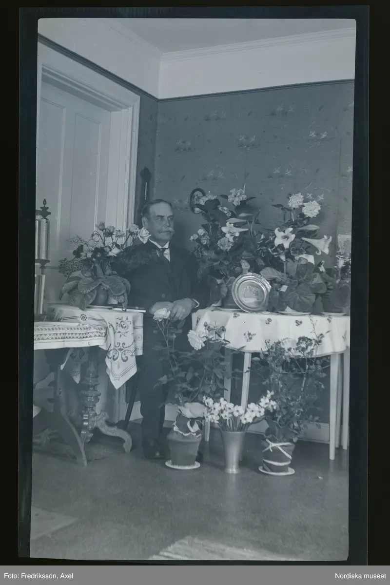 Porträtt av en man som sitter vid ett bord fullt av gratulations-blommor.