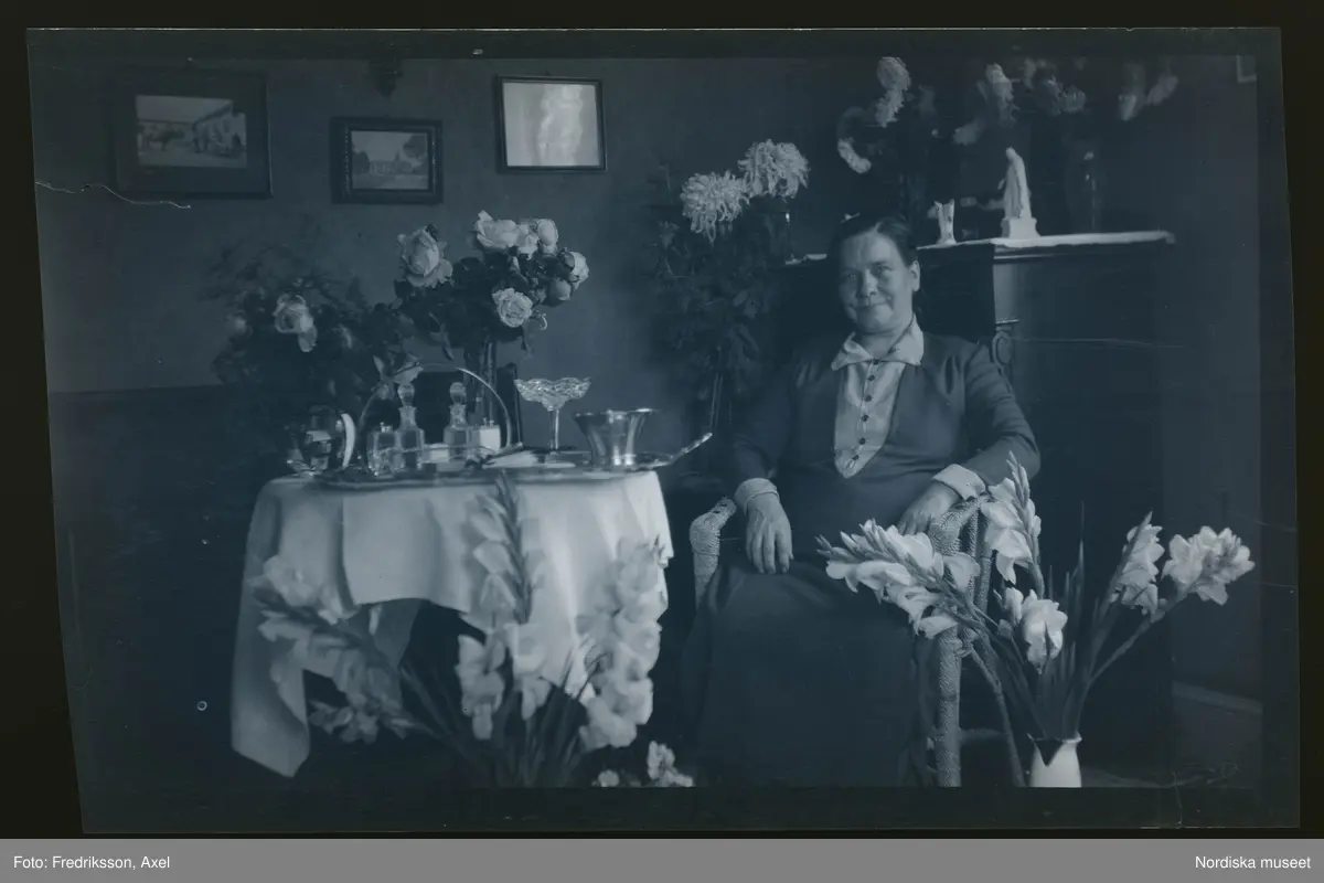 Porträtt av en kvinna som sitter vid ett bord fullt av gratulations-blommor.