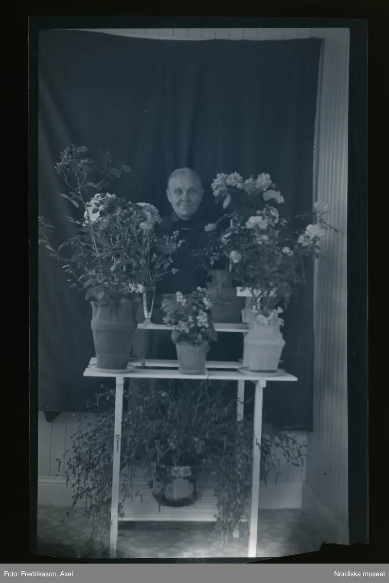 Porträtt av en kvinna som står vid ett bord fullt av gratulations-blommor.