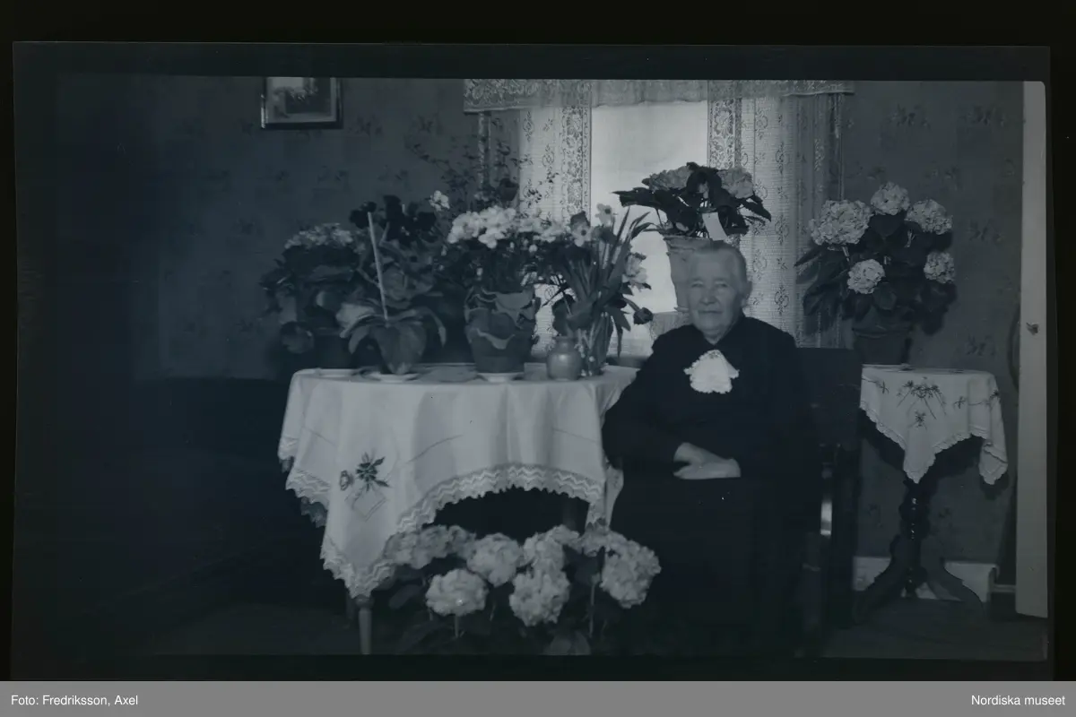 Porträtt av en kvinna som sitter vid ett bord fullt av gratulations-blommor.