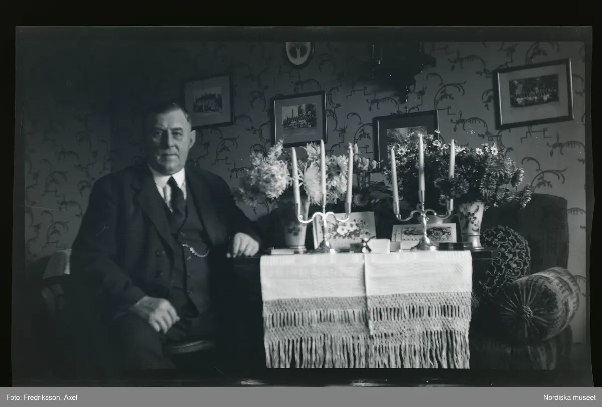 Porträtt av en man som sitter vid ett bord fullt av gratulations-blommor.