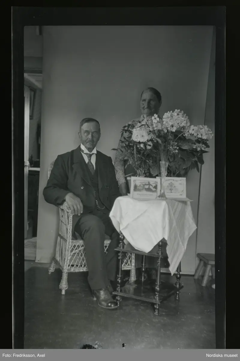 Porträtt av Fredrik Vilhelm Eriksson (f.1854) och Anna Maria Larsdotter (f.1856) vid ett bord fullt av gratulations-blommor.