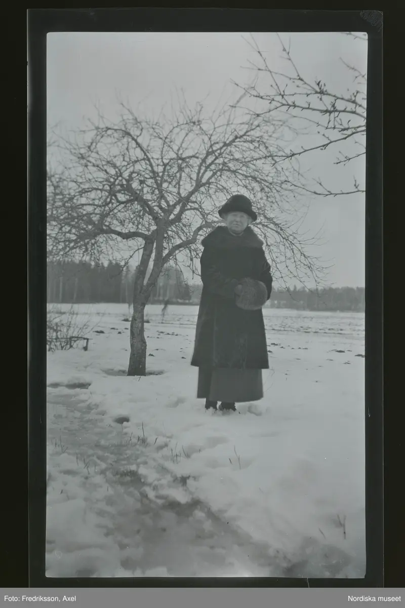 Porträtt av en kvinna i snön, med händerna i en muff.
