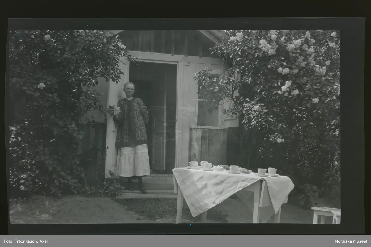 En kvinna står i dörren till en stuga, utanför i trädgården är kaffekoppar och kakor uppdukade på ett bord.