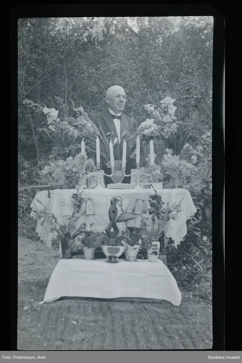 Porträtt av en man som står vid ett bord fullt av gratulations-blommor.