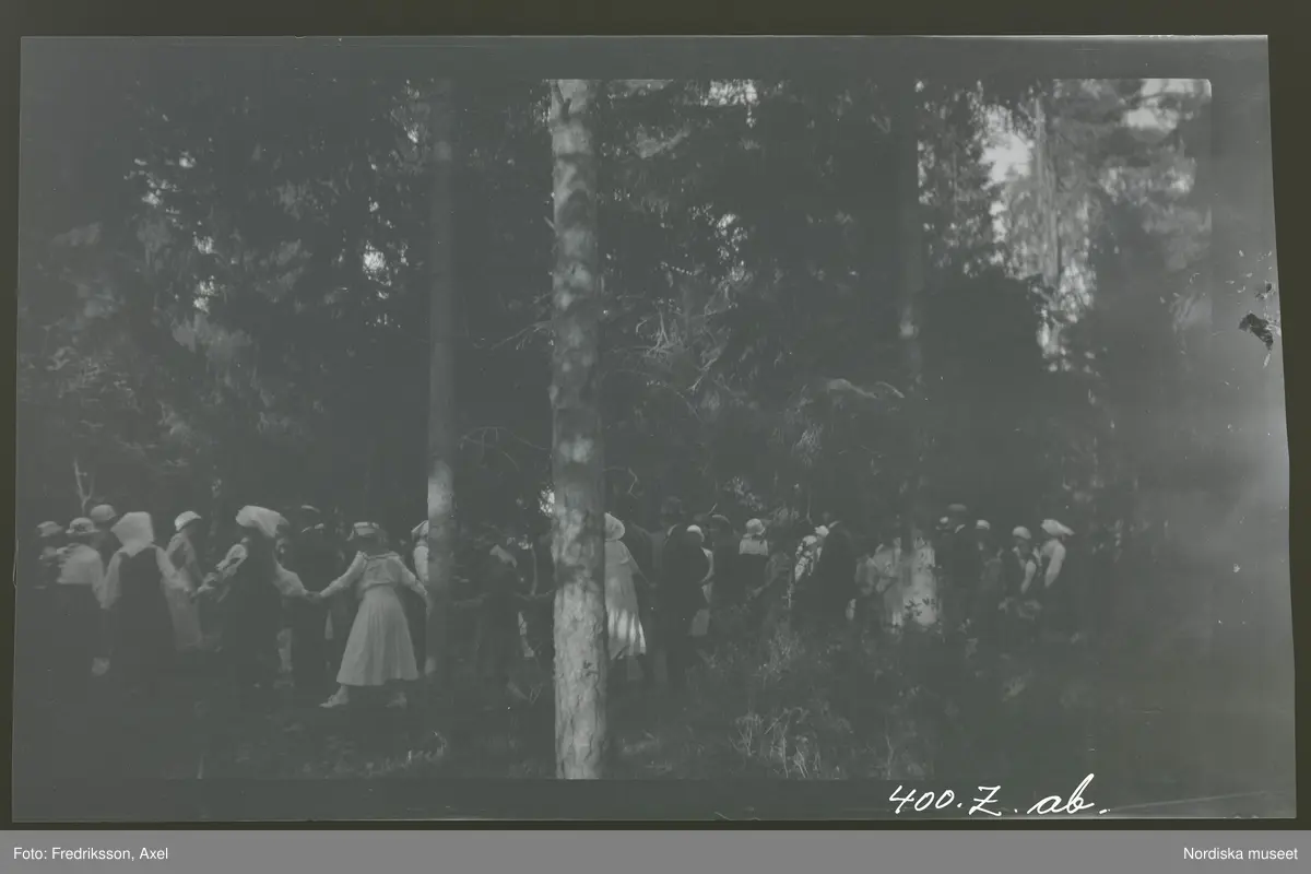 Det dansas folkdans mellan träden. Några av dansarna bär folkdräkt.